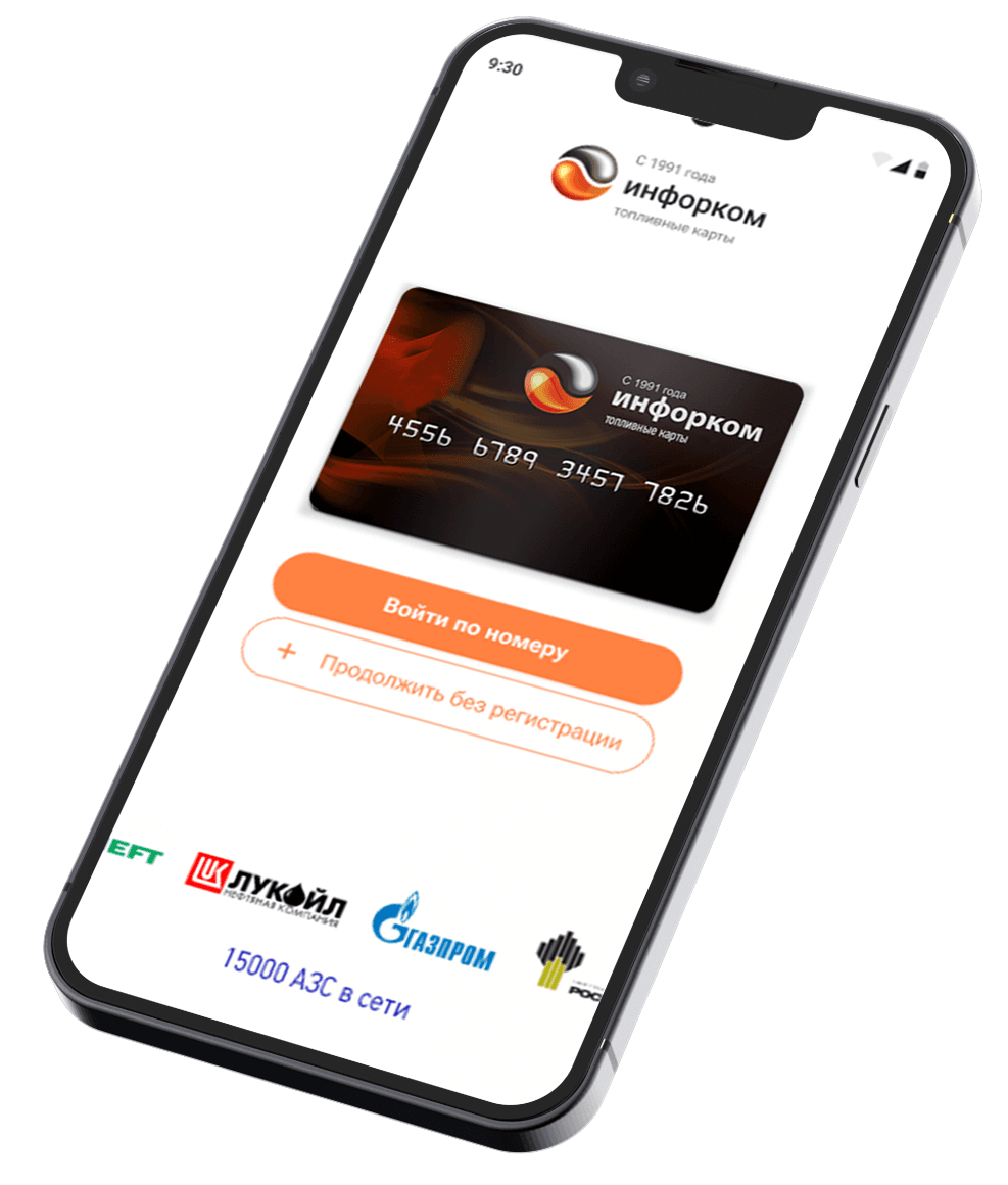 Доступ в мобильное приложение и Личные кабинет на нашем сайте могут получить только клиенты ИНФОРКОМ. Чтобы стать нашим клиентом – достаточно оставить заявку и заключить договор. Обращаем ваше внимание, что ИНФОРКОМ предоставляет топливные карты для юридических лиц и ИП. Мы не обслуживают физические лица!